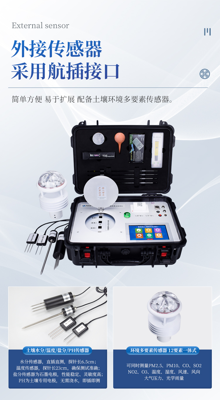 ★13.环境多要素传感器为12要素一体式,可同时测量PM2.5、PM10、CO、SO2、NO2、O3、温度、湿度、风速、风向、大气压力、光学雨量