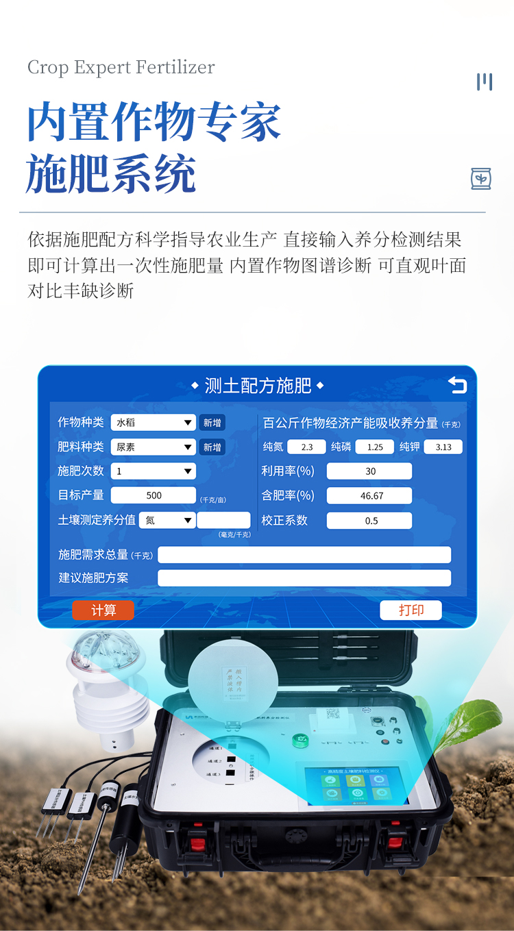 简要描述: 高智能土壤环境测试及分析评估系统设备内置测土配方施肥系统,检测完成后可直接进行测土配方施肥计算;同时具有单独配方施肥计算模块;仪器内置百余种常见经济作物标准养分值,内置施肥校正系数,可对目标产量计算施肥量,以此指导农业生产;测土配方施肥结果可打印,打印内容包含作物种类、肥料种类、目标产量、需求总量、建议施肥方案。