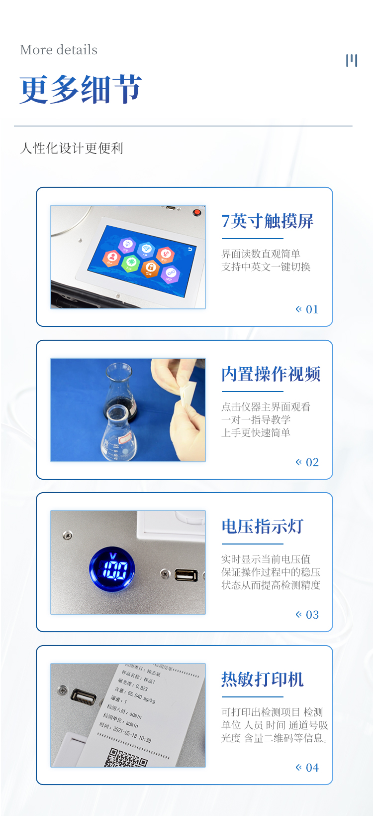 7.数据打印:内置热敏打印机(无需更换色带),可打印出检测项目、检测单位、检测人员、检测时间、通道号、吸光度、养分含量(mg/kg)、以及二维码等信息。