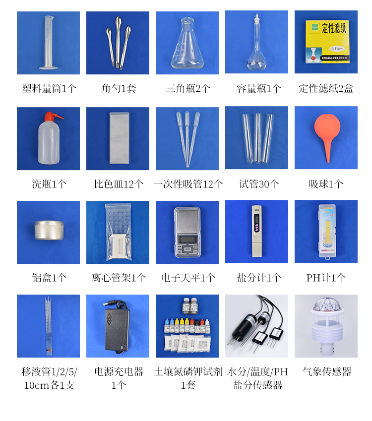 土壤:土壤铵态氮、土壤有效磷、土壤速效钾、土壤硝态氮、土壤水解氮、土壤全氮、土壤全磷、土壤全钾、土壤有机质(丘林法)、土壤有机质(浸提法)、土壤钙、土壤镁、土壤硫、土壤硅、土壤硼、土壤铁、土壤铜、土壤锰、土壤锌、土壤氯、土壤钼、土壤铅、土壤砷、土壤铬、土壤镉、土壤汞、土壤镍、土壤铝、土壤氟、土壤钛、土壤硒、PH、含盐量、水分。