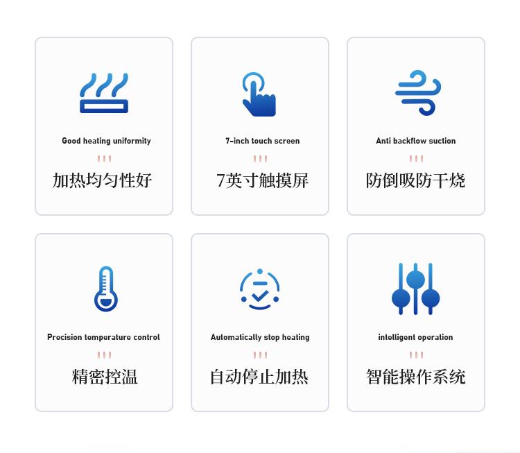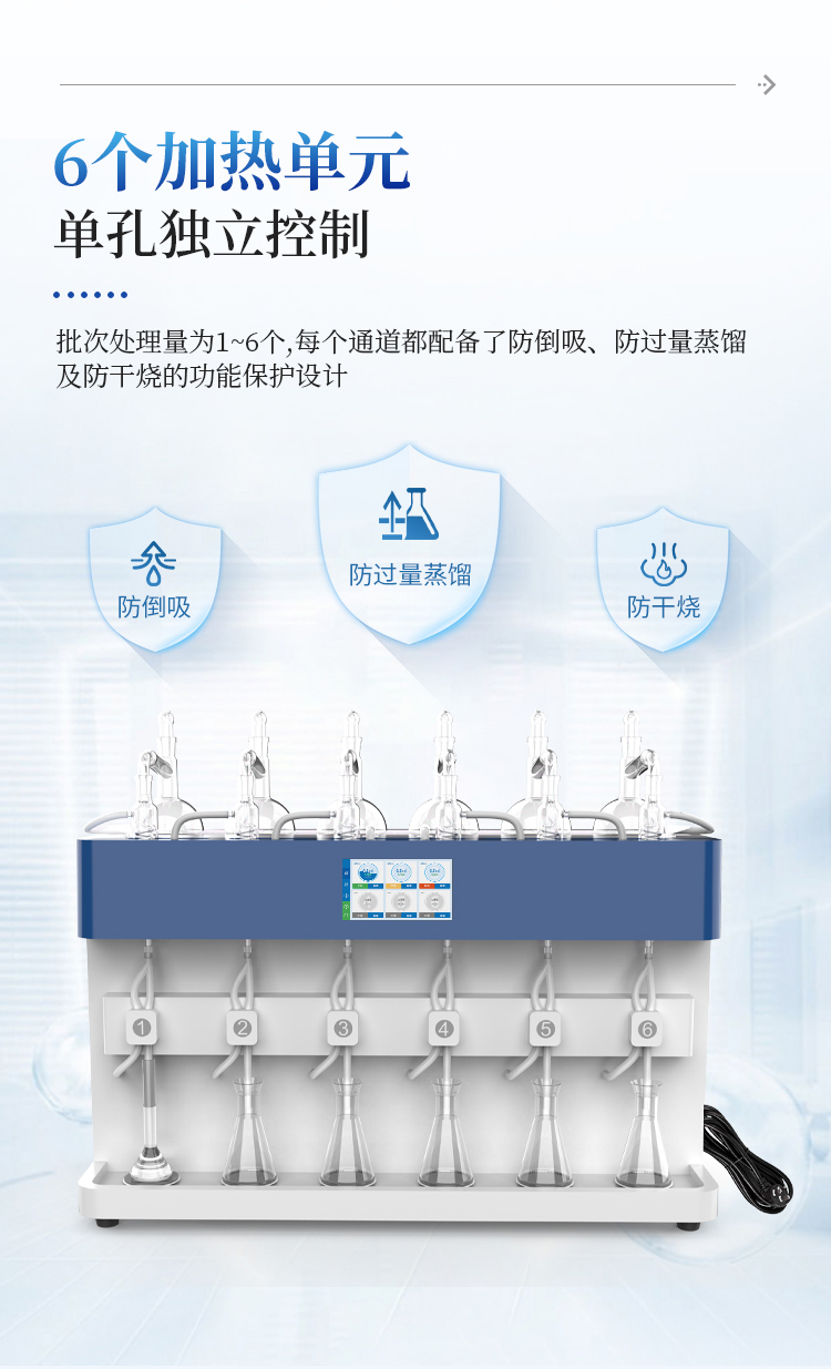 2.多通道独立控制:3个加热单元各自独立,配备防倒吸、防过量蒸馏及防干烧保护。