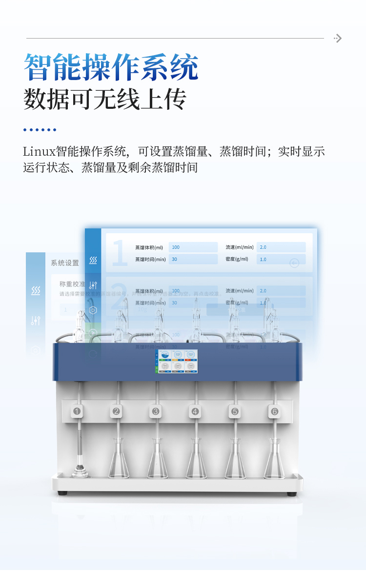 3.智能触控:7寸液晶触摸屏,支持自定义保存最多1000种蒸馏方法,内置18种国标方法。