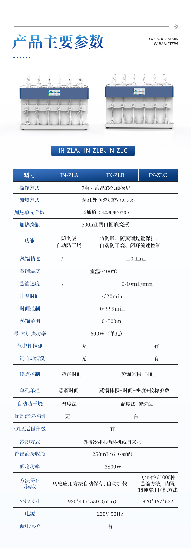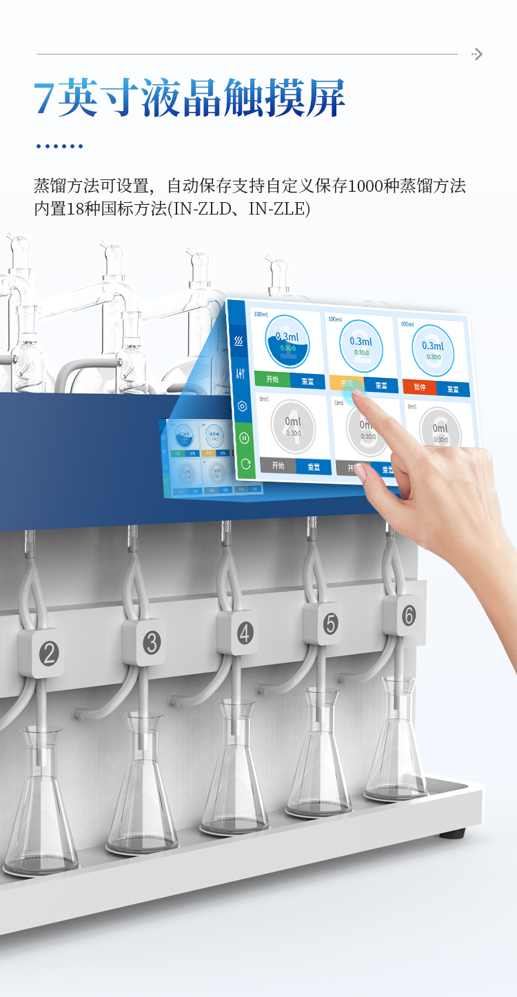 简要描述: 全自动多功能蒸馏仪IN-ZLB采用7寸液晶触摸屏控制,蒸馏方法可设置,自动保存,下次开机可直接使用;系统自带校正蒸馏体积(重量)功能。加热模块采用标准碗状玻纤电热套加热器,确保样品容器(圆底烧瓶)与热源密切贴合,加热功率调节范围广、加热均匀性好、热辐射效率高,蒸馏速度快、使用寿命长。