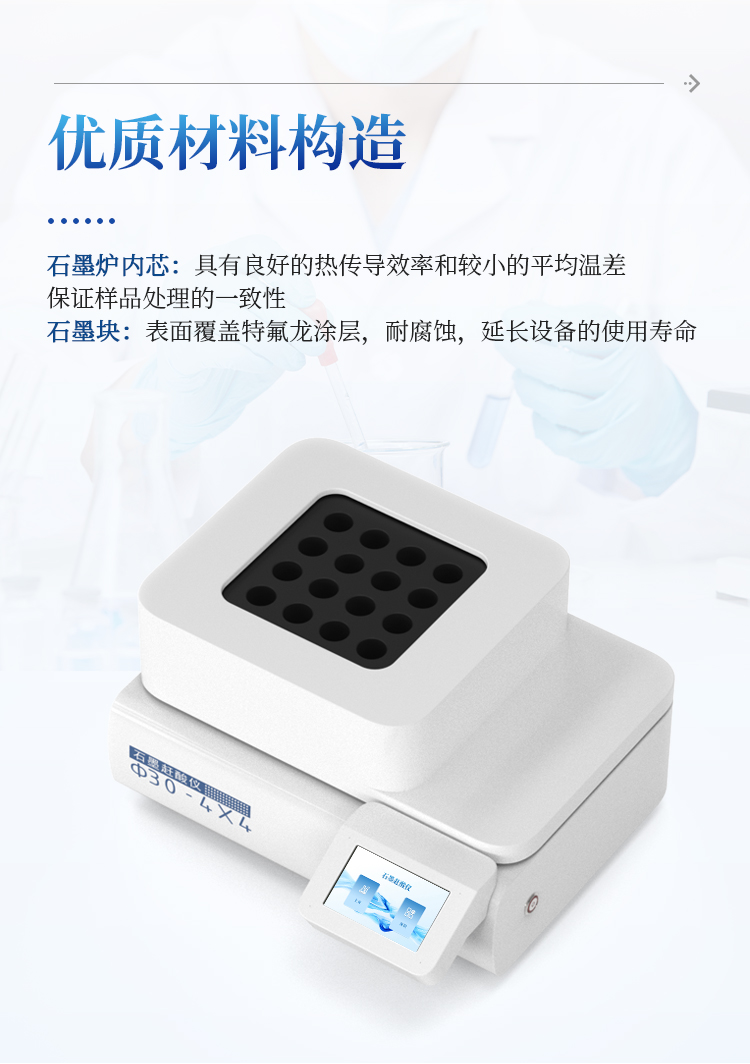 本石墨消解仪是替代传统电热板、电热炉的理想选择,同时仪器采用经典的30 mm孔径设计,完美兼容市场主流的50 mL、100 mL消解管,是实验室值得信赖的得力助手。