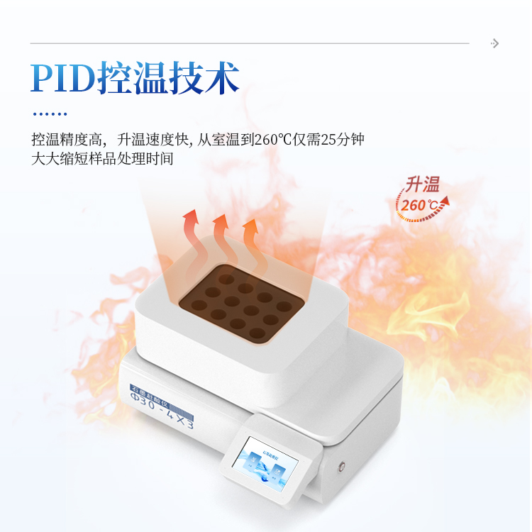 采用PID 控温技术,控温精度高,升温速度快, 从室温到260℃仅需25分钟。