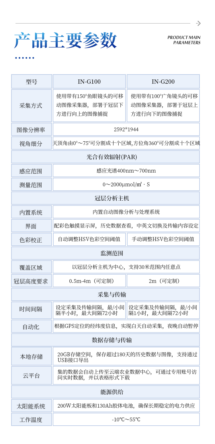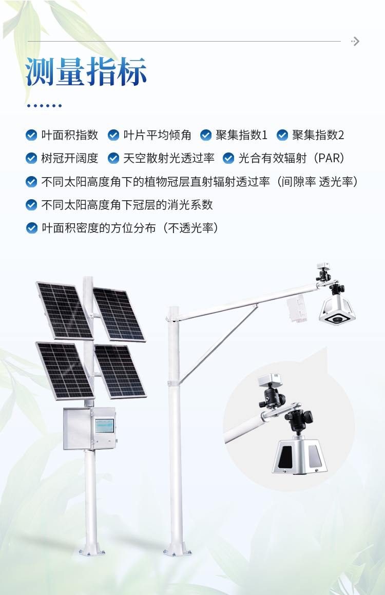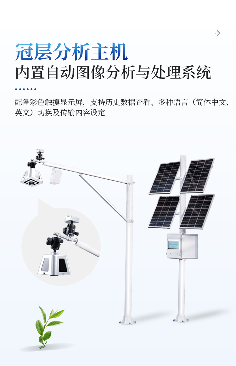 太阳能供电系统、冠层分析主机、可移动式图像采集器(含100°镜头)、传输模块、安装支架、数据云平台