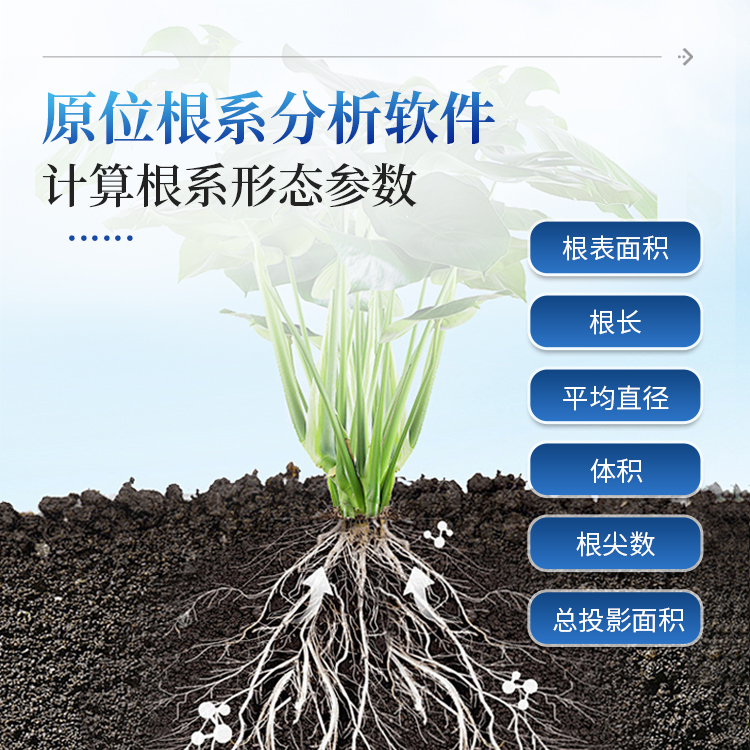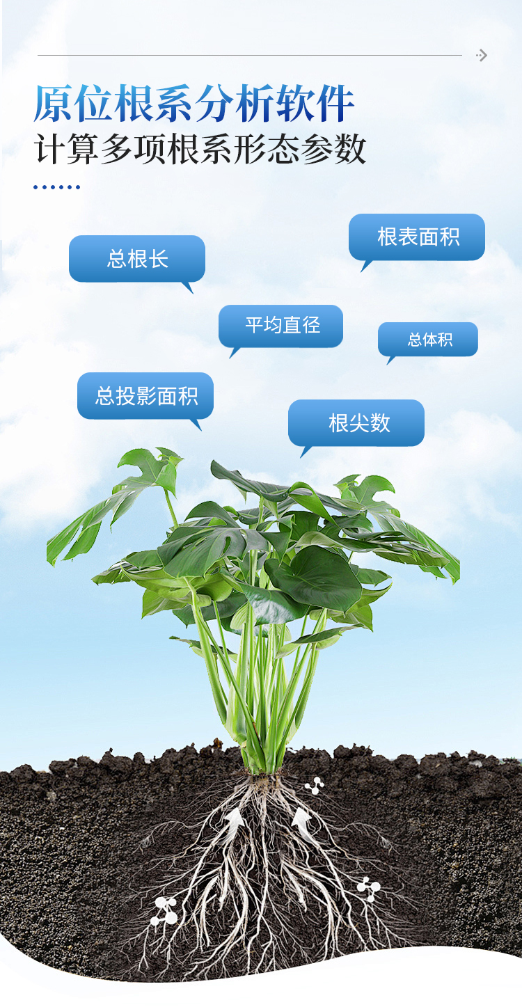 利用专业的原位根系分析软件可快速的分析计算获得总根长、平均直径、表面积、总投影面积、总体积、根尖数等根系形态参数。