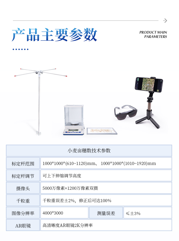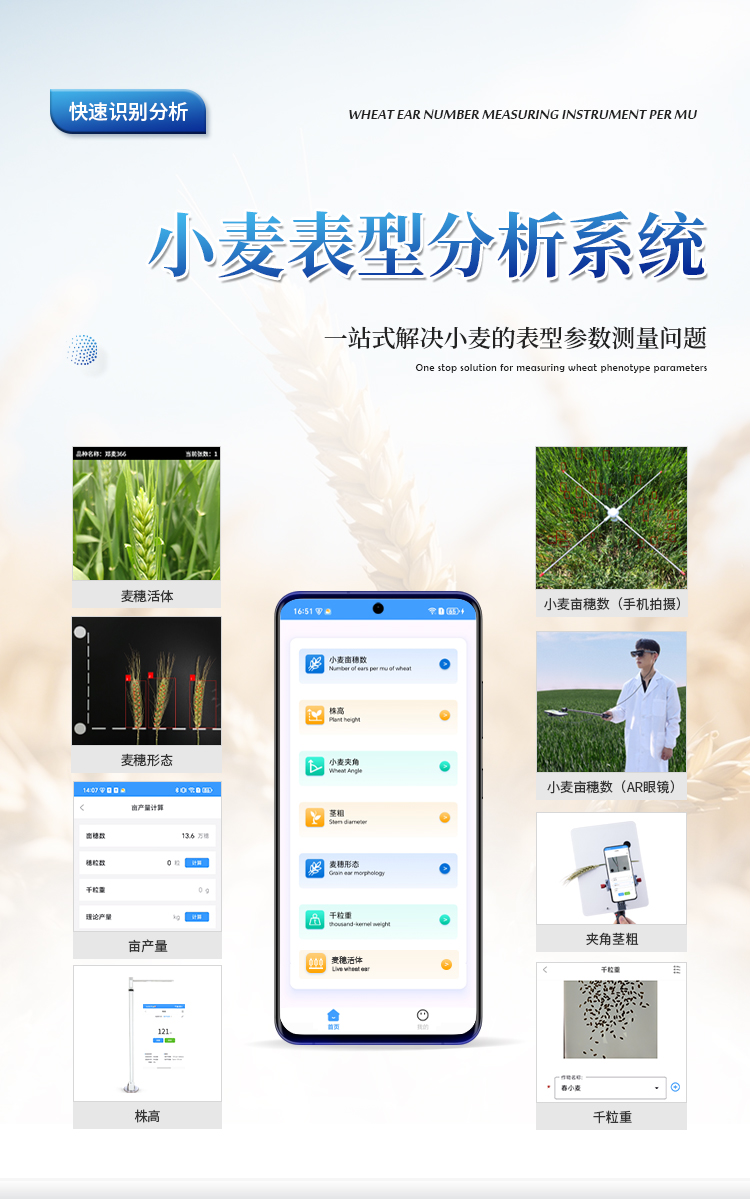 小麦亩穗数测量主要用于快速、准确地测量单位面积内的小麦穗数。该设备结合图像识别技术、人工智能算法与高分辨率摄像系统,通过对实地拍摄的小麦图像进行分析,自动识别并计数麦穗数量,极大地提高了测量效率与准确性。