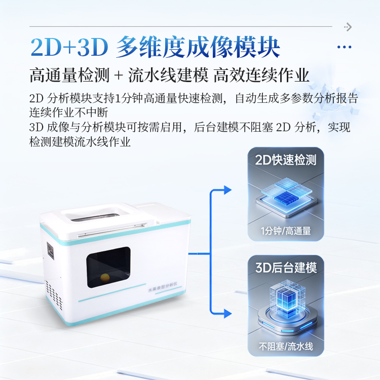 8、3D成像与分析模块:在2D分析完成后,用户可按需选择3D成像分析;3D模型在后台自动排队生成,同步输出3D形态参数、颜色参数及纹理参数,且不阻塞2D分析的连续执行,实现检测与建模的流水线作业;