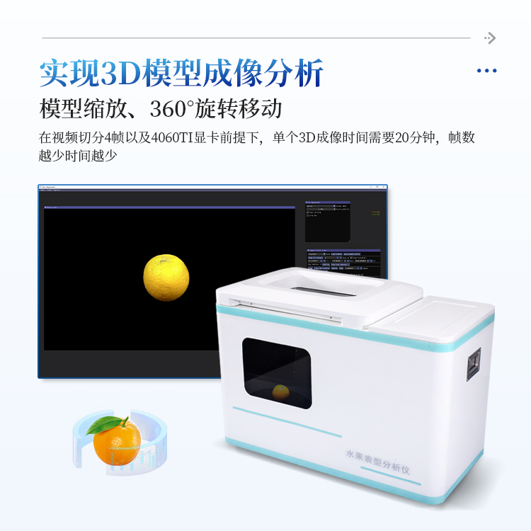 简要描述: 水果表型分析仪是根据图像识别、3D Gaussian Splatting等技术实现模型成像以及分析的。本产品使用了最新的AI成像分析技术,在多视角的条件下对苹果、橘子、梨、西瓜等水果进行扫描,通过生成3D点云图并动态绘制水果表面纹理等操作构建三维的水果模型。同时在进行模型成像过程中也会对水果的形态、纹理、颜色等特征进行分析。