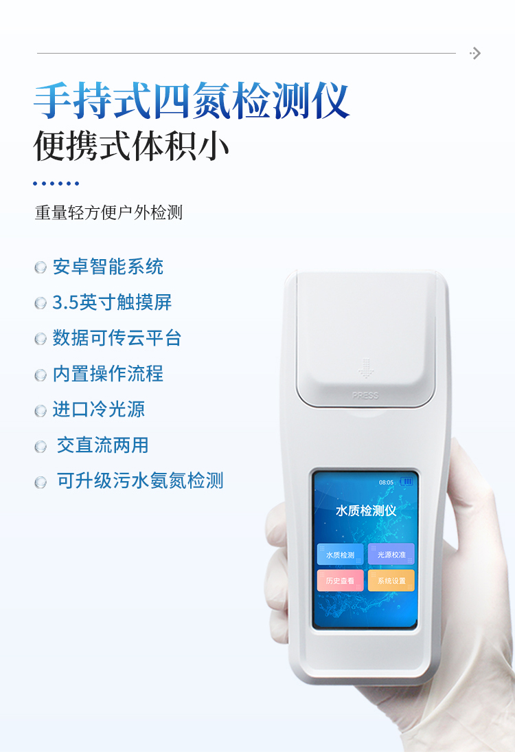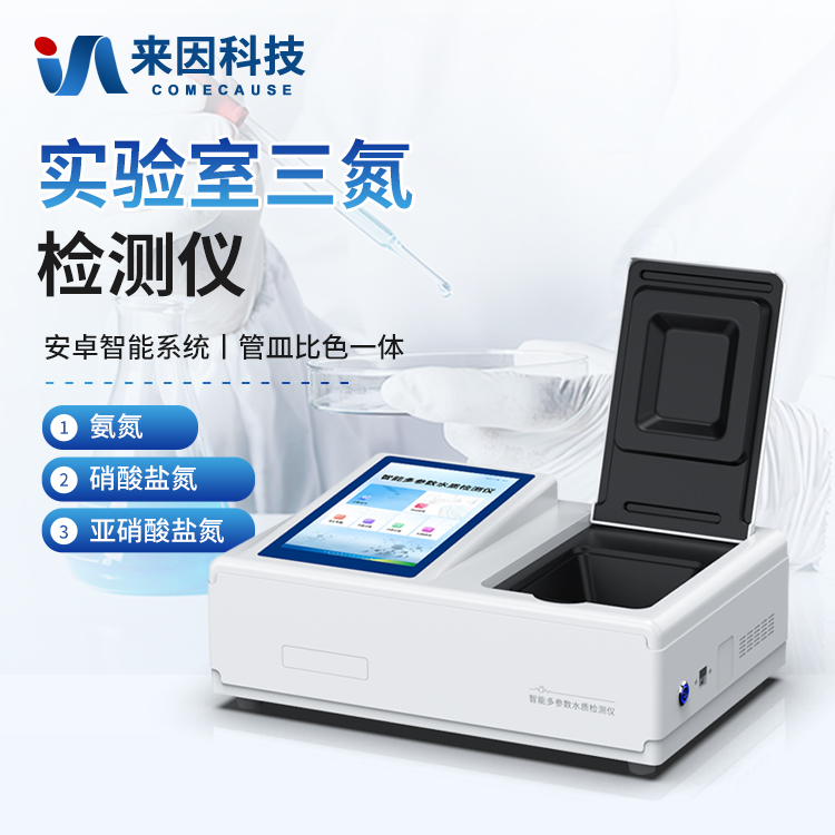 简要描述: 台式水质三氮检测仪是参考相关标准研发设计制造,本仪器主要检测水质氨氮、硝酸盐氮、亚硝酸盐氮浓度指标,兼具智能数据分析功能,图表、列表显示数据,分析一目了然;高清晰度彩色液晶触摸显示屏,Android智能操作系统,中文显示界面,中英文键盘,人性化操作,使用更简单。