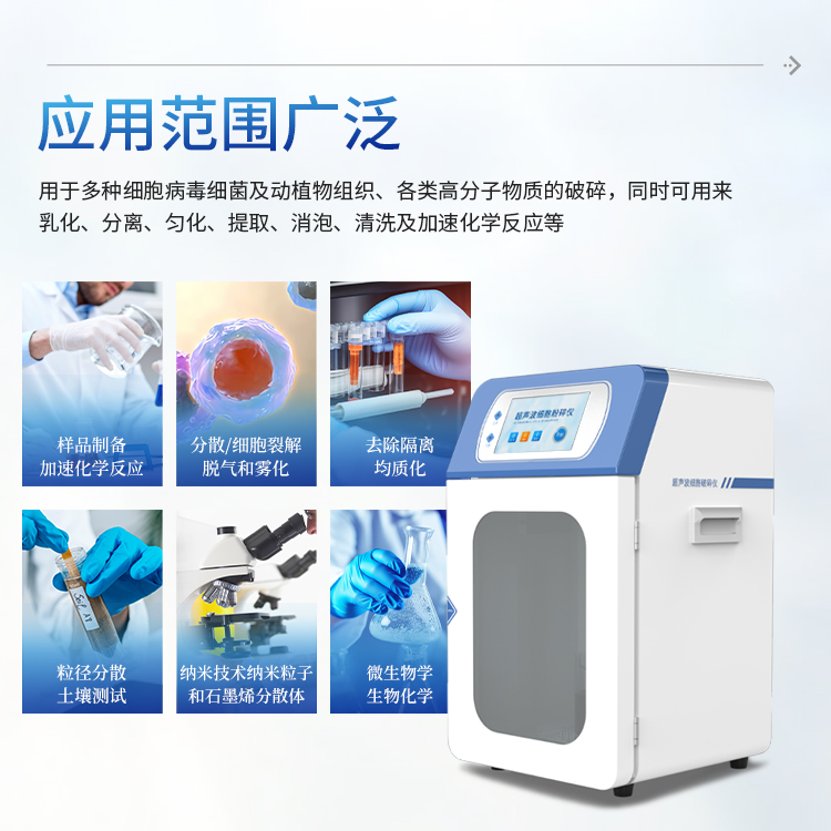 超声波细胞破碎仪是一种利用强超声在液体中产生空化效应,对物质进行超声处理的多功能、多用途的仪器,能用于动植物组织、细胞、细菌、芽胞菌种的破碎,同时可用来乳化、分离、分散、匀化、提取、脱气、清洗及加速化学反应等等。