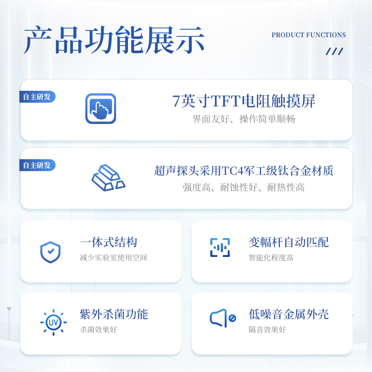 自研自产的超声波细胞破碎仪,将隔音箱融入到主机中形成一体化。功能齐全、外观新颖、性能可靠。仪器采用大屏液晶显示;中央微机集中控制,超声输出、间隙时间、超声功率,样品温度监测显示,频率自动跟踪,故障自动报警等功能。适用于生物化学、微生物学、药物化学、表面化学、物理学、动物学、农学、医学、制药等领域的教学、科研及生产。