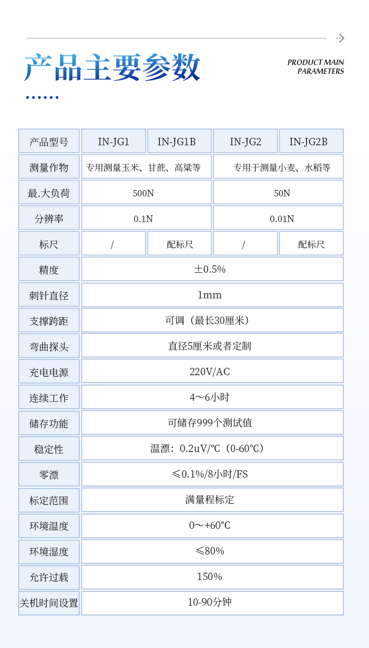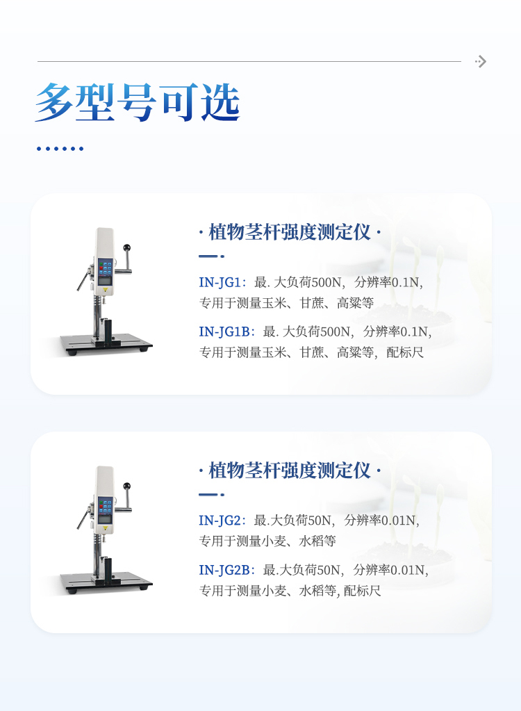 1、三种不同测头:可进行茎杆弯折性能测量、茎秆抗压强度测量、茎杆组织结构(穿刺)强度测量;弯折支架距离可调,并标有刻度。