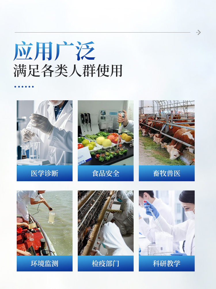 1、食品安全: 致病微生物、农兽药残留、生物毒素等快速筛查。
