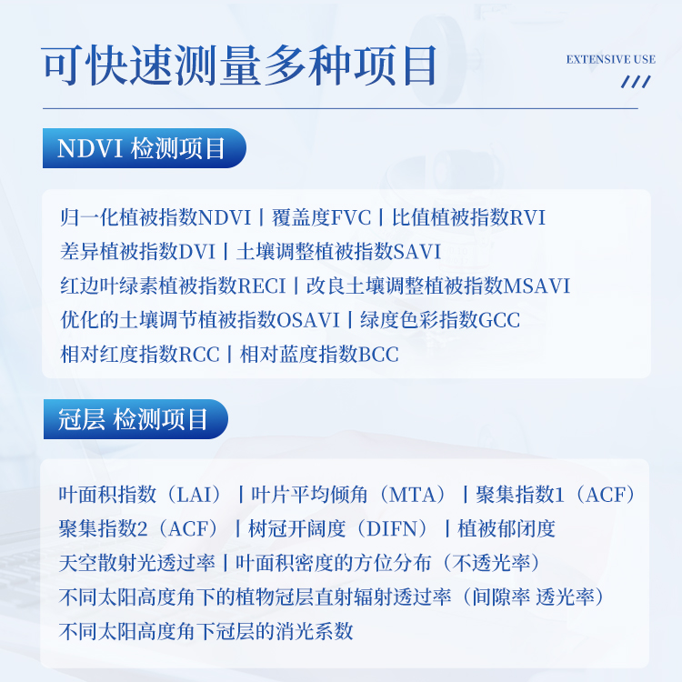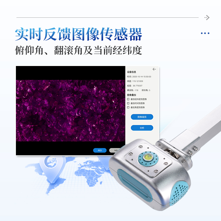 该仪器主要用于草地、农田、湿地、林地等野外数据采样调查,使用方便快捷,精准获取高分辨率的RGB影像以及红光光谱、近红外光谱影像数据,自动计算植被覆盖度FVC,NDVI,LAI冠层等植被指数