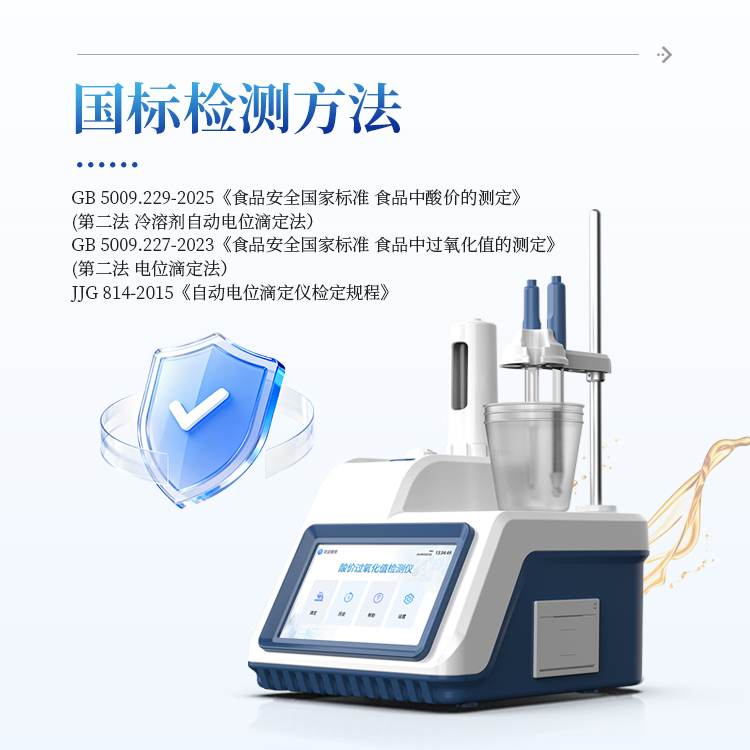 简要描述: 酸价过氧化值检测仪基于自动电位滴定技术,专用于食品中酸价和过氧化值的精准测定。遵循食品安全国家标准预置酸价与过氧化值标准化检测程序,搭配高精度滴定系统,实现“一键检测”,同时兼具常规滴定模式。可为食品企业、质检机构及科研院所提供油脂氧化稳定性评价解决方案。
