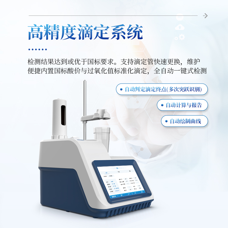 3.内置国标酸价与过氧化值标准化滴定,自动判定滴定终点(多次突跃识别)、自动绘制曲线、自动计算与报告的“全自动”一键式检测;