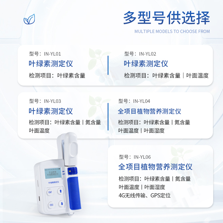 简要描述: 叶绿素测定仪IN-YL04可以即时测量植物的叶绿素相对含量(单位 SPAD)或绿色程度、氮含量、叶面温度,从而了解植物真实的硝基需求量并且了解土壤硝基的缺乏程度或是否过多地施加了氮肥。可以通过此款仪器来 增加氮肥的利用率,并可保护环境。可广泛应用于农林相关科研单位和高校对植物生理指标的研究和农业生产的指导。
