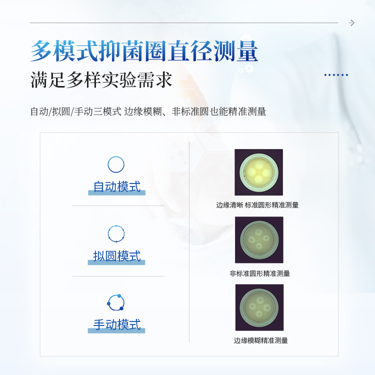 本产品是一款集图像采集、数据处理与统计分析于一体的菌落计数及抑菌圈测量仪,广泛应用于食品、药品、化妆品、环境监测、医疗卫生、科研院校等领域。仪器采用先进的数字图像处理技术,具备荧光菌识别、抑菌圈测量及效价测定和杀菌功能,可快速精准完成培养皿内菌落的测量分析、抑菌圈测量及抗生素效价测定,大幅提升实验效率,有效降低人工操作误差。