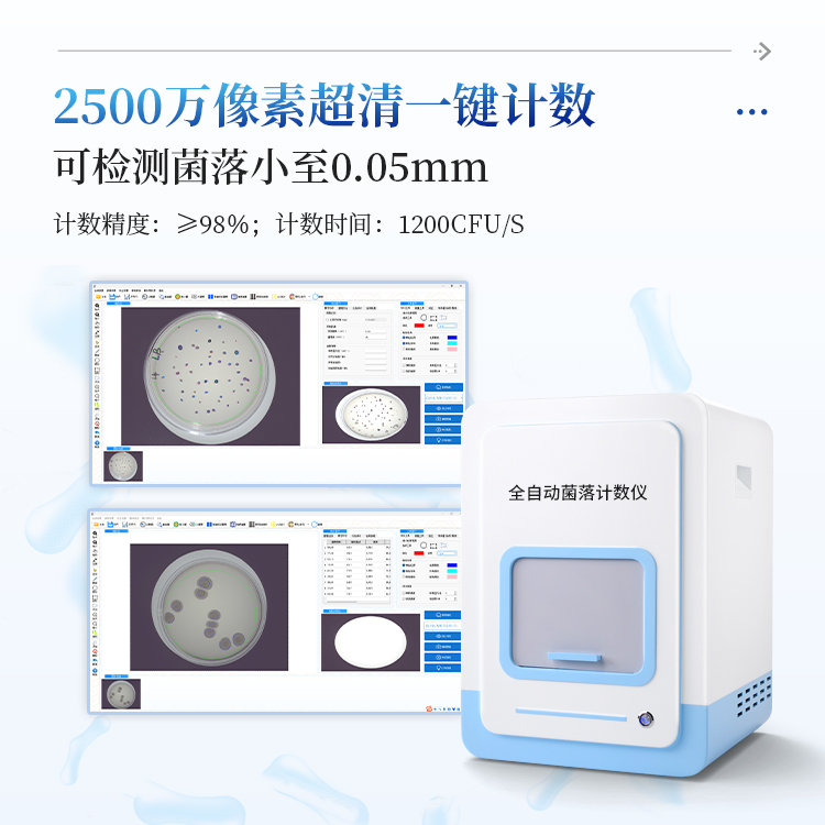 简要描述: 菌落总数快速检测仪是一款集图像采集、数据处理与统计于一体的自动菌落计数,广泛应用于食品、药品、化妆品、环境监测、医疗卫生、科研院校等领域的菌落计数。该仪器采用先进的数字图像处理技术,具备荧光菌识别和杀菌功能,可实现对培养皿中菌落的快速、准确、全自动计数,显著提升实验效率,降低人工误差。