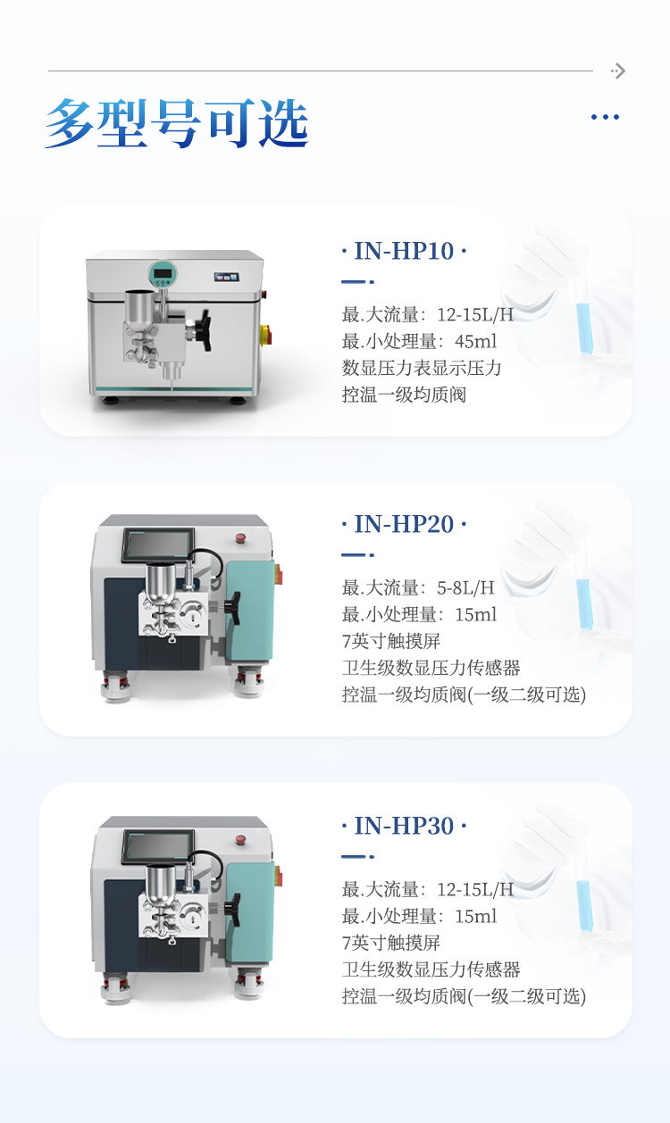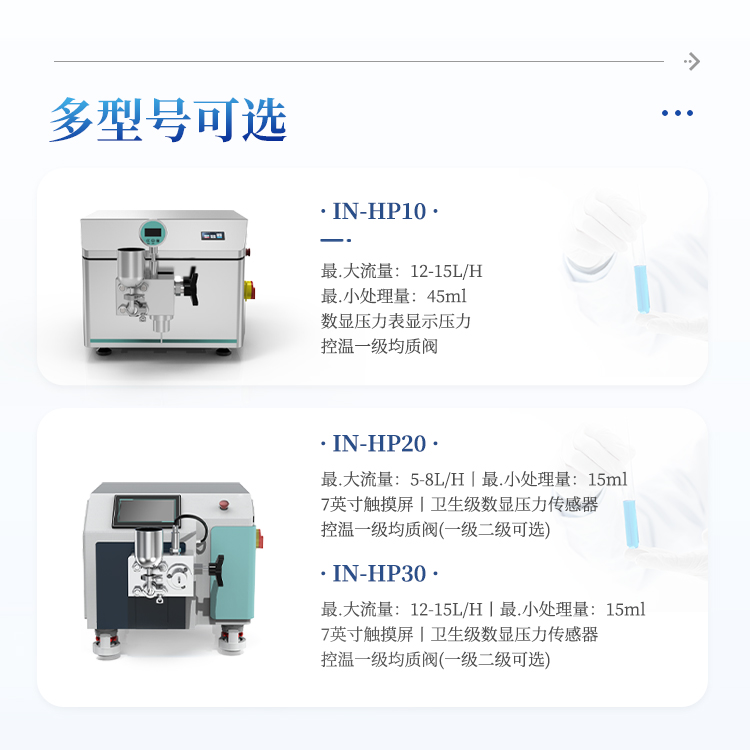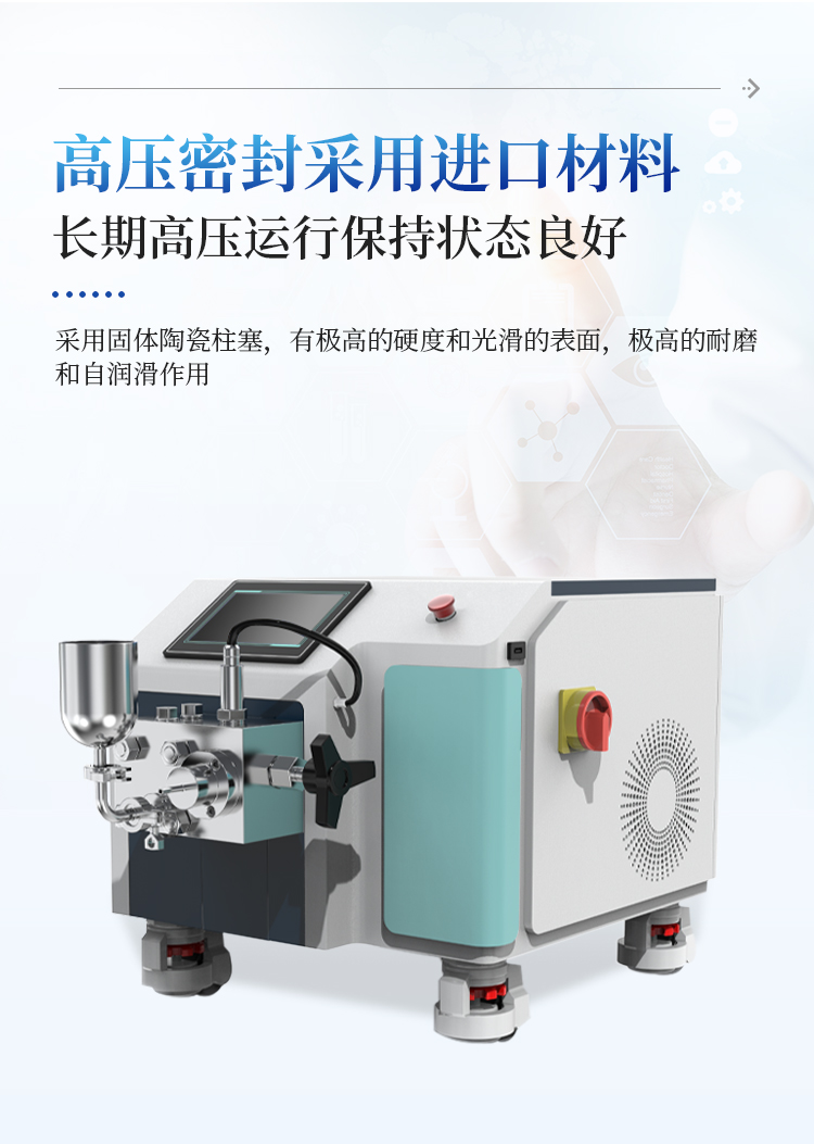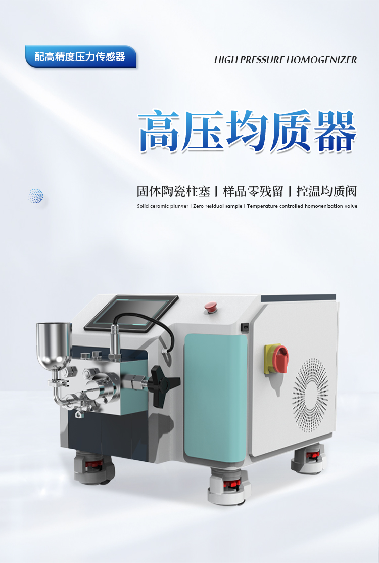简要描述: 高压均质机是以高压往复泵为动力传递及物料输送机构,将物料输送至工作阀部分。物料在通过工作阀的过程中,在高压下产生强烈的剪切、撞击和空穴作用,从而使液态物质或以液体为载体的固体颗粒得到超微细化。样品残留量:样品零残留。流量控制可根据实验需求实时调节流量大小。