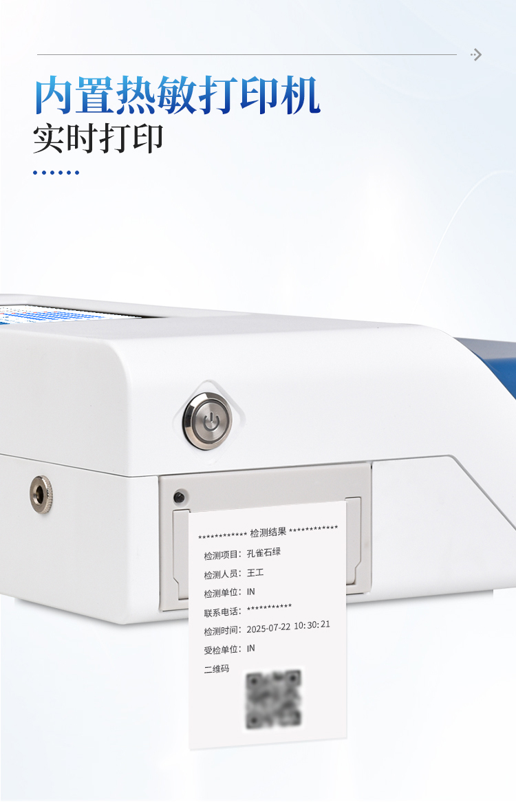16、检测结果:报告出检测项目、被测物质的结果、检测单位、被检查单位、检验员、检测时间、检测限等信息可在触摸屏上显示,可通过仪器内置打印机输出